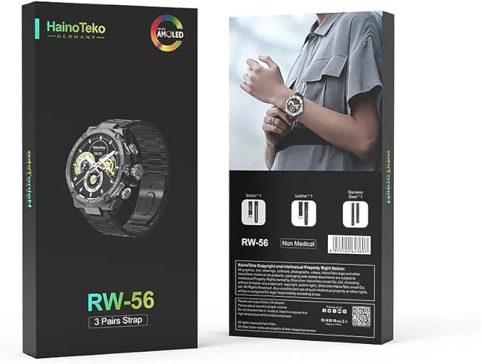 Generic - ساعة ذكية ألمانية مقاومة للصدمات طراز RW56 مع 3 سوار (فولاذ مقاوم للصدأ / جلد / سيليكون)، شاشة أموليد دائرية، مكالمات بلوتوث، شحن لاسلكي، لون كلاسيكي / رياضية / عصرية، (أسود)