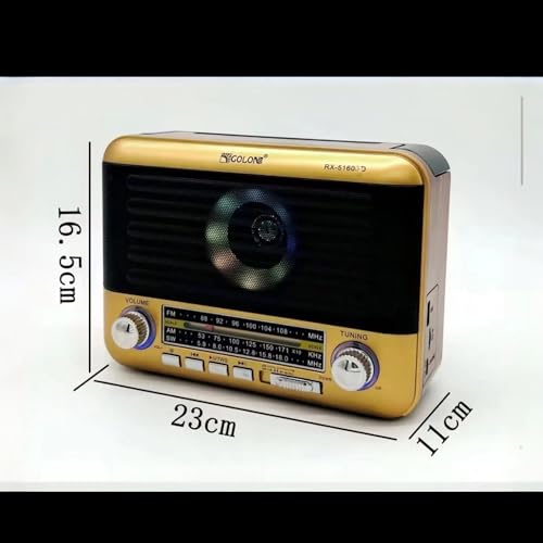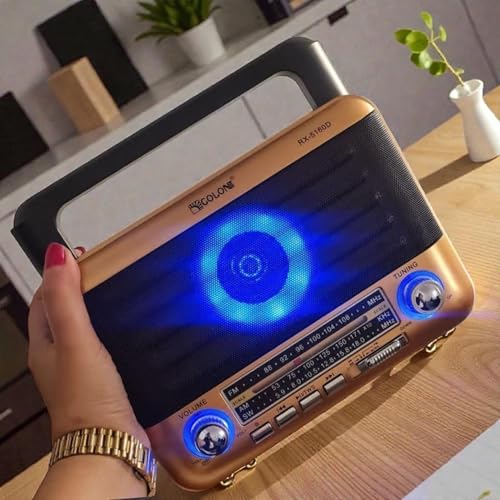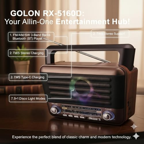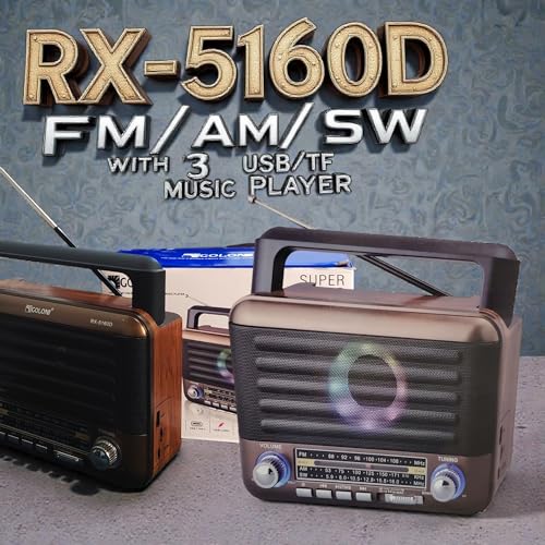 Generic - راديو رترو RX-5160D مع بلوتوث، راديو FM/AM/SW ثلاثي النطاقات، مشغل موسيقى USB/TF، دعم ستيريو تي دبليو اس، اوضاع اضاءة الديسكو، شحن نوع C، بطارية 18650 متضمنة