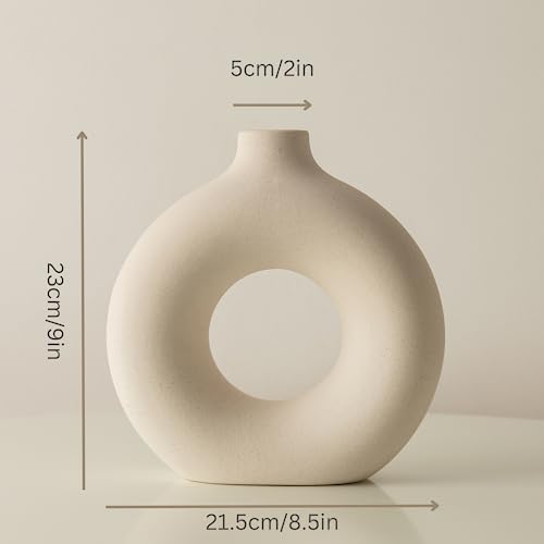 - فازة بيضاء على شكل دونات يمكن استخدامها كإكسسوارات منزلية مزخرفة للعديد من ديكورات الغرف والمنزل - تصميم بوهو وريفي وجمالي وعصري وفريد من نوعه؛ هذه الفازة الخزفية البيضاء مصنوعة من السيراميك عالي الجودة بنسبة 100%، كما أنها متينة وتدوم طويلاً،