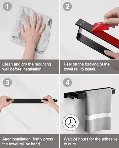 - سهل التركيب: قضيب المنشفة الأسود ذاتي اللصق، ويأتي الجزء الخلفي مع شريط لاصق لا حاجة إلى حفر الثقوب، فقط قم بإزالة الجزء الخلفي من الغشاء الواقي للشريط اللاصق للتركيب. يرجى الانتباه إلى الحفاظ على الجدار جافًا ونظيفًا قبل التركيب، والانتظار 24 ساعة بعد التركيب قبل الاستخدام.
