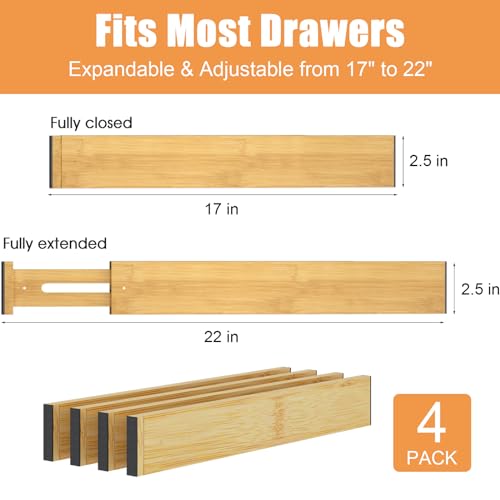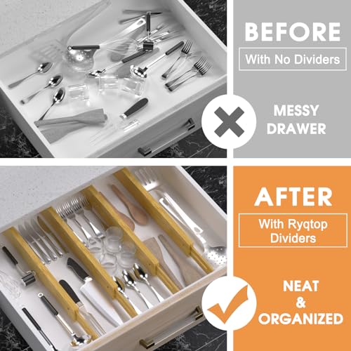 Ryqtop - فواصل ادراج من الخيزران، منظم ادراج المطبخ قابل للتعديل للملابس، 4 قطع من فواصل تنظيم الادراج القابلة للتوسيع لغرفة النوم والحمام وخزانة الملابس والمكتب، لون طبيعي