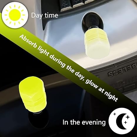 - 【تأثير فلورسنت】تمتص أغطية صمام إطار عجلات السيارة الضوء عندما يكون ساطعًا وينبعث منها الضوء في الظلام. عندما تبدأ العجلة في التحرك ليلًا، فإنها تومض تلقائيًا وتخلق دائرة من الضوء تجعل السيارة/ الموتوسيكل/ الدراجة تبدو جميلة.