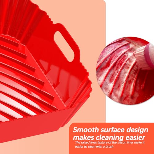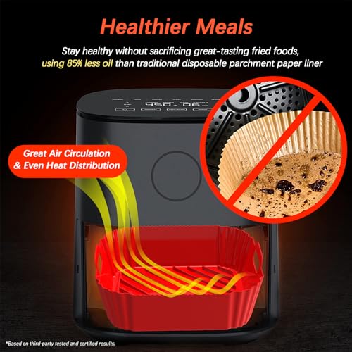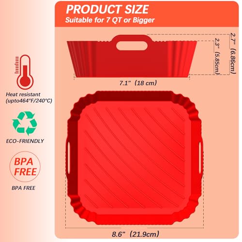 - مواد صحية وقابلة لإعادة الاستخدام: بطانات سيليكون مربعة للقلاية الهوائية مصنوعة من السيليكون الآمن غذائيًا، خالية من مادة بيسيفينول أ، تتحمل درجات حرارة تصل إلى (220 درجة مئوية)، اجتازت اختبار إدارة الغذاء والدواء الأمريكية. صديقة للبيئة وقابلة لإعادة الاستخدام، بديل مثالي لبطانات ورق الزبدة القابلة للاشتعال التي تستخدم لمرة واحدة، لتجنب مخاطر الحريق بشكل فعال