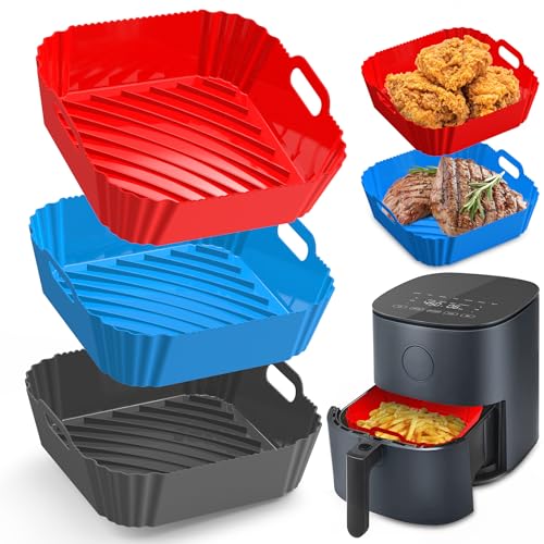 Sackei - بطانات سيليكون للقلاية الهوائية مربعة 22 سم من ساكي، 4 - 7 لتر مقاومة للحرارة قابلة لإعادة الاستخدام وغير لاصقة لسلة القلاية الهوائية وصينية خبز واكسسوارات فرن أدوات مطبخ، 3 قطع أسود أحمر أزرق