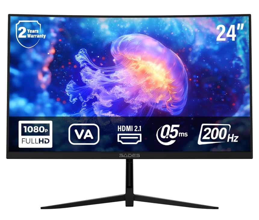 SADES - شاشة ألعاب منحنية FHD مقاس 24 بوصة، SA-04F24B - 1920 × 1080، معدل تحديث 200Hz، وقت استجابة 0.5ms، HDMI 2.1 من سادس