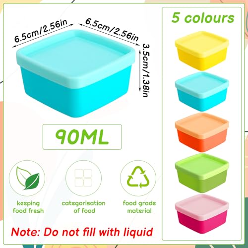 - حجم مثالي للتحكم في الكمية: كل حاوية للوجبات الخفيفة تحمل 90 مل، مثالية للأجزاء الصغيرة من المكسرات أو الحلويات أو الفواكه المجففة أو حتى التوابل. حجمها الصغير يجعلها سهلة التخزين في الحقائب أو صناديق الغداء أو على أرفف المطبخ - رائعة لإدارة الأجزاء والحفاظ على الوجبات الخفيفة طازجة طوال اليوم