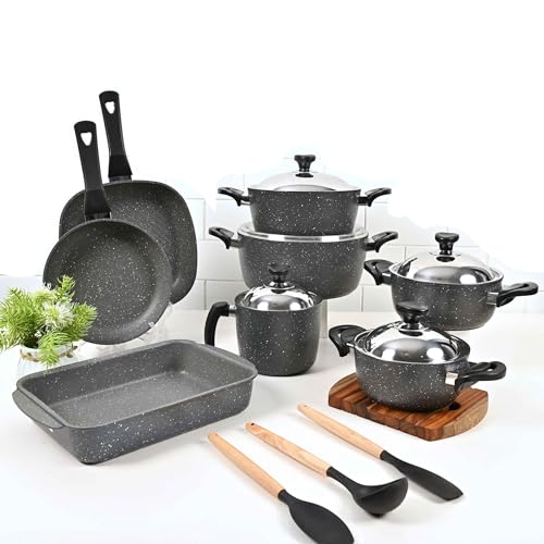 SAFLON - طقم أواني جرانيت للطهي تريند لاين دائرية من سافلون، 13 قطعة، رمادي، 66037GR