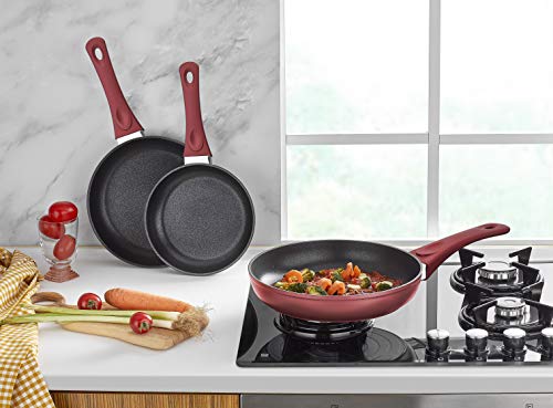SAFLON - سافلون طقم مقالي من التيتانيوم المقاوم للالتصاق 3 قطع 4 ملم الالومنيوم المطروق مع طلاء مقاوم للخدش خالي حمض بيرفلورو الاوكتانويك انجلترا امن للاستخدام في غسالة الصحون أحمر