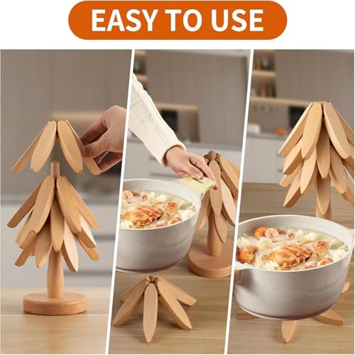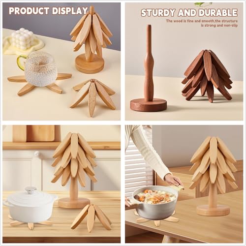 SAHENITEANA - مجموعة من 4 حوامل خشبية للاطباق الساخنة من ساهينيتيانا، مجموعة دعامات على شكل شجرة، وسادة طاولة قابلة للطي من خشب الزان على شكل شجرة للاطباق الساخنة، 4 حوامل خشبية + 1 حامل (خشب بورليوود)