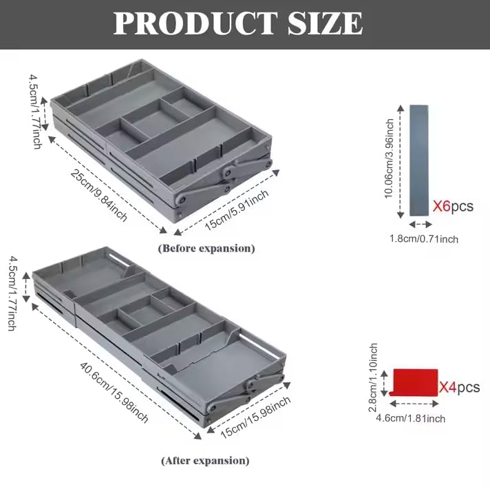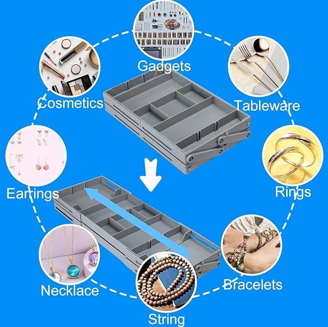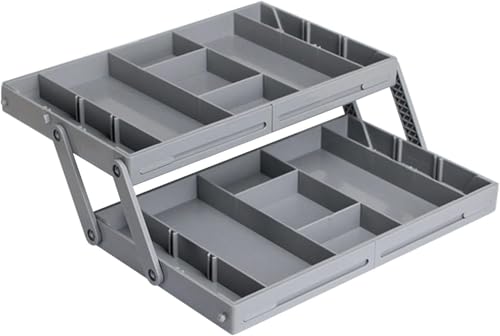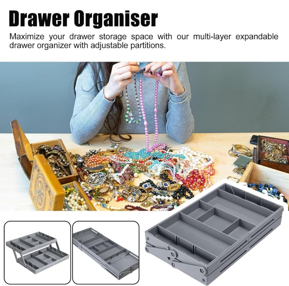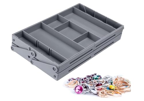 Saiyam - صينية تنظيم مجوهرات بدرجين من طبقتين من سايام، منظم أدراج ذكي قابل للتوسيع متعدد الأقسام، منظمات أدراج مسطحة قابلة للطي للأدوات المكتبية والمكياج (لون رمادي)