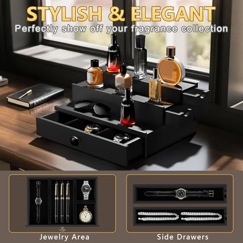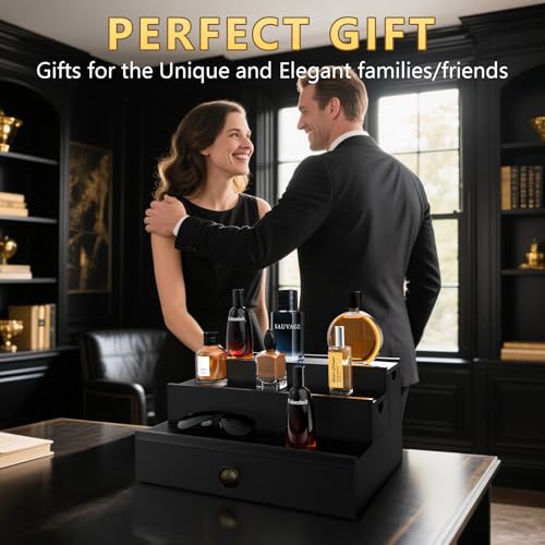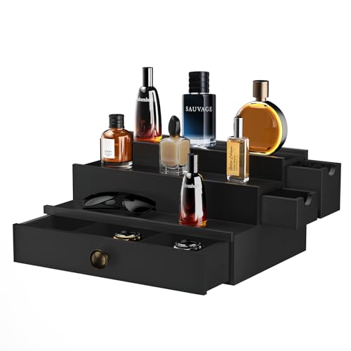SAKAKI - منظم كولونيا للرجال، حامل عطور، حامل كولونيا خشبي مع درج متدفق وحجرة مخفية، منظم عطور، رف عرض الكولونيا، هدية رائعة للرجال