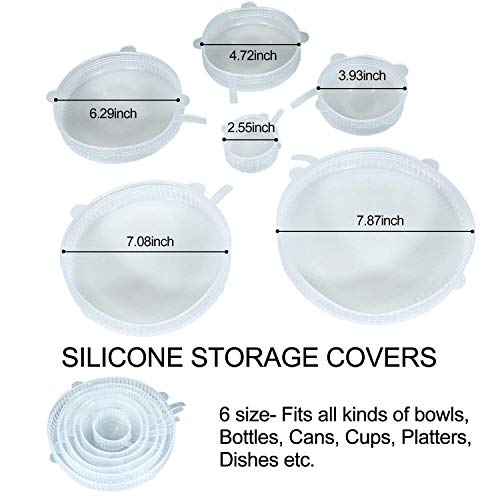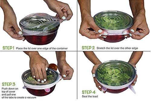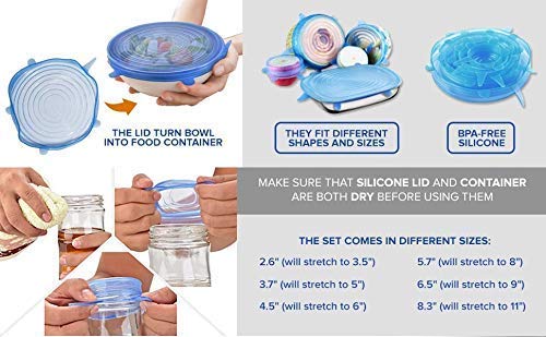 - تتضمن هذه المجموعة 6 أغطية سيليكون شفافة بمقاسات مختلفة. بفضل خامتها القابلة للتمدد، ستناسب أغطية الطعام بسهولة معظم الأوعية والأواني والحاويات والأكواب والعلب والبرطمانات ويمكنك حتى استخدامها لتغطية البطيخ أو الشمام المقطوع إلى نصفين.