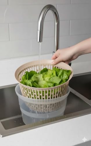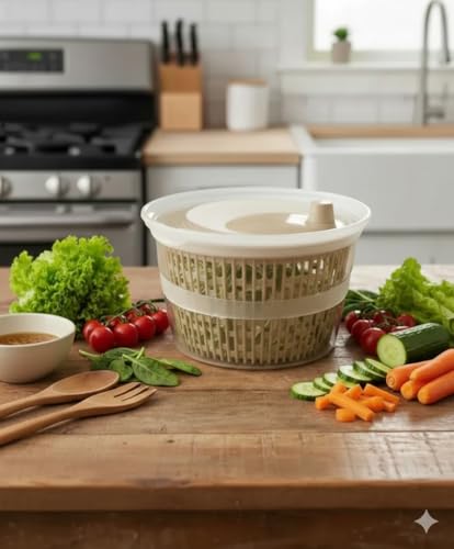 - آلية تجفيف فعالة: تتميز بمقبض مريح يتيح الدوران السلس والسهل لإزالة الماء الزائد بسرعة، مما يضمن أن السلطة الخضراء مقرمشة وجاهزة للتقديم