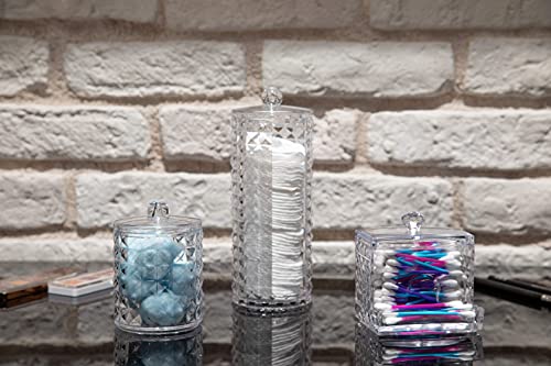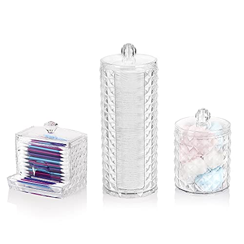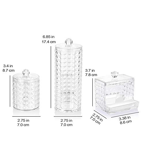 - 1- طقم من 3 قطع من مستلزمات الحمام: إنّه طقم اسكسوارات الحمام المثالي لتنظيم وترتيب مساحة الزينة الخاصة بك، فهي تتضمن موزع وسادات قطنية وموزع عيدان قطنية وحامل كرات من الصوف القطني، هذه العبوة قابلة لإعادة الملء وإعادة الاستخدام بحجم كبير لأسابيع من اللوازم