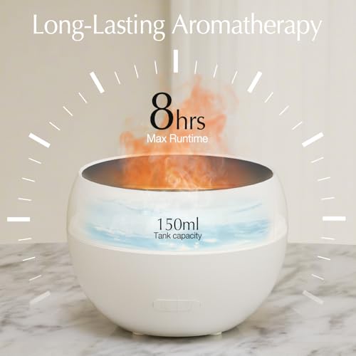 SALKING - سالكنج موزع زيوت عطرية سعة 150 مل، موزع روائح بالموجات فوق الصوتية مع تاثير اللهب، ايقاف تلقائي، مرطب هواء لغرفة النوم واليوغا، موزع روائح علاجية، ابيض