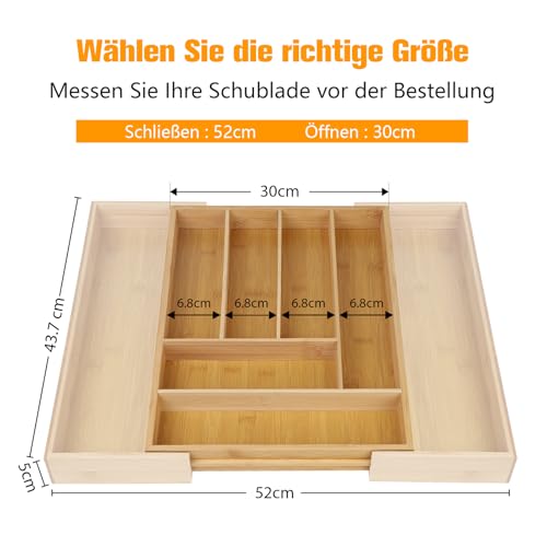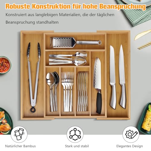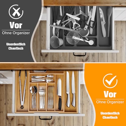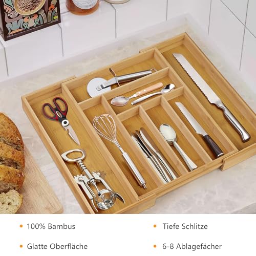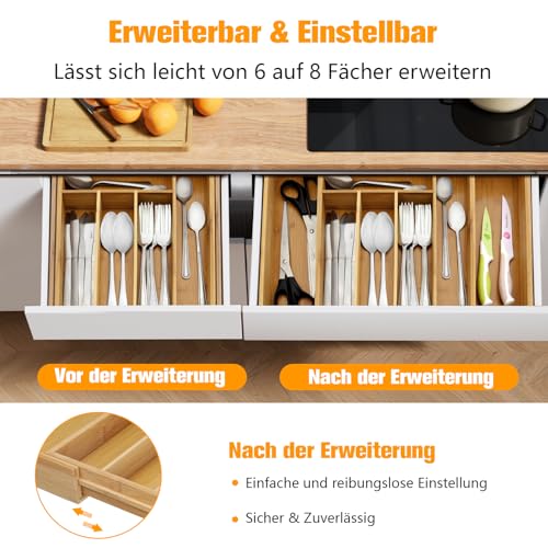 Sampoes - صينية ادوات مائدة للادراج من سامبوس، حامل ادوات مائدة من الخيزران لدرج المطبخ، حامل ادوات مائدة قابل للتوسيع مع 6 الى 8 مقصورات، منظم درج المطبخ للملاعق والشوك والسكاكين