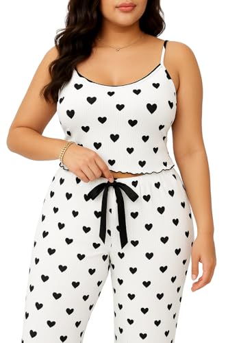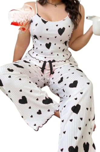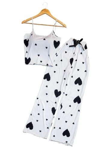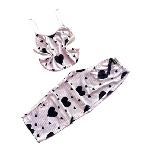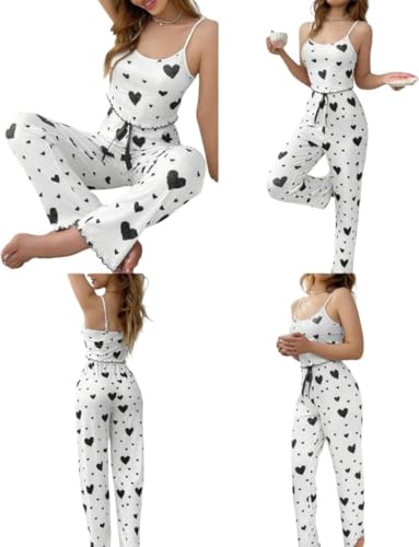 Generic - بيجامة نسائية قطعتين بقلوب من سمسومه ، حمالات رفيعه ، قماش ريب مضلع مريح ، طقم نوم عصري وأنيق للبيت والاسترخاء