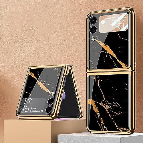 Generic - جراب فاخر ولطيف من الزجاج المقوى بدرجة صلابة 9 والبولي كربونات مضاد للصدمات مع حماية عالية الجودة من السقوط وحافة بلون ذهبي لموبايل سامسونج جالاكسي Z فليب 4 5G مناسب للنساء والرجال، لون اسود وبرتقالي