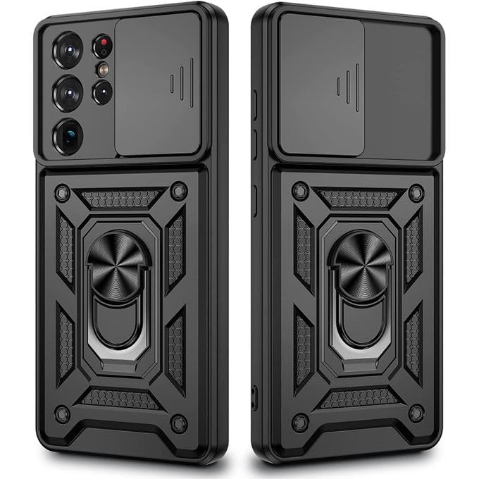Generic - سامسونج اس 21 الترا جراب شيلد لحماية متكاملة من اقوى الصدمات مع غطاء كاميرا متحرك ودبلة معدنية متعددة الوظائف لهاتف جالكسي 22 اولترا s21 ultra ، حافظة بسيطة أسود