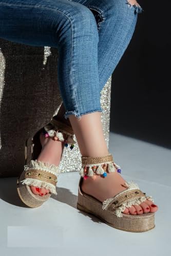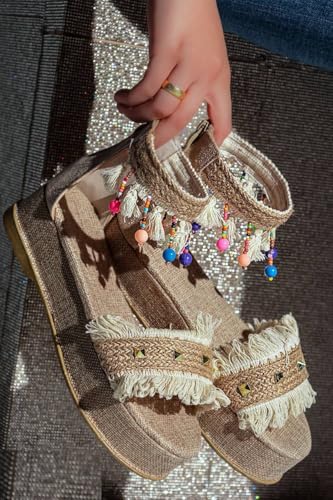 Life Stylish - صندل مسطح من الخيش مع زينة K-13 - بيج