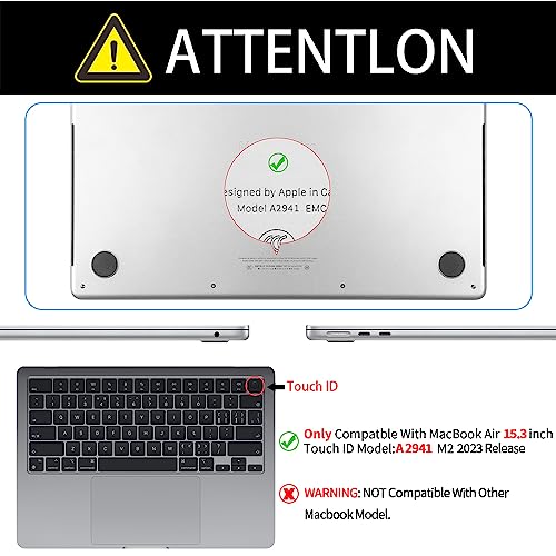 - [متوافق فقط مع] مصمم ليناسب تمامًا ماك بوك اير 15 بوصة شريحة M2 مع شاشة ليكويد ريتينا وخاصية تاتش اي دي إصدار 2023 (موديل A2941: MQKU3CH/A,MQKQ3CH/A,MQKR3CH/A, MQKT3CH/A,MQKV3CH/A,MQKW3CH/A,MQKP3CH/A,MQKP3CH/A 3CH/،،MQKX3CH/A). تحذير: هذه الحافظة غير متوافقة مع موديلات ماك بوك الأخرى. يرجى التحقق من رقم الموديل "Axxxx" على ظهر اللاب توب قبل الشراء، تأكد من اختيار نفس رقم الطراز تمامًا كما هو موضح في عنوان القائمة "A2941".