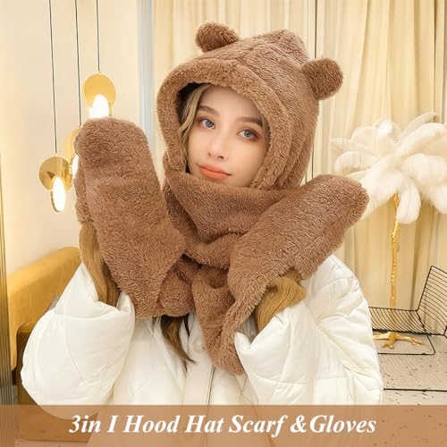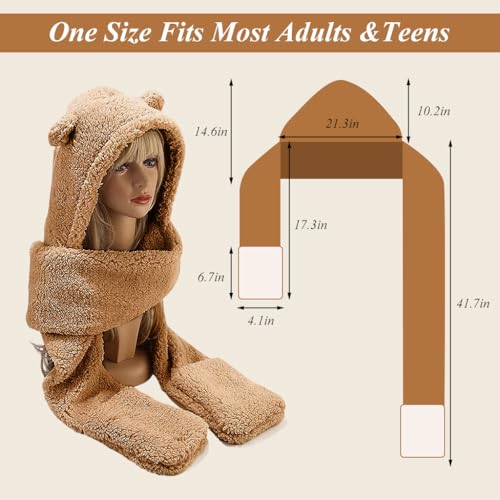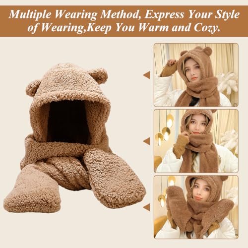 SANNIDHI - سكارف شتوي كاواي 3 في 1 بتصميم أذني دب لطيف من سانيدهي®، سكارف سكودي دافئ وقبعة طويلة وجوانتي هدية للبنات