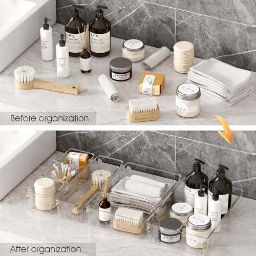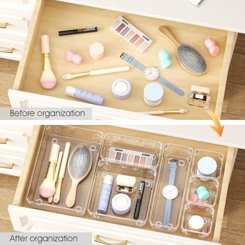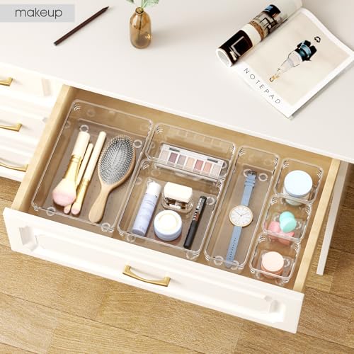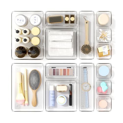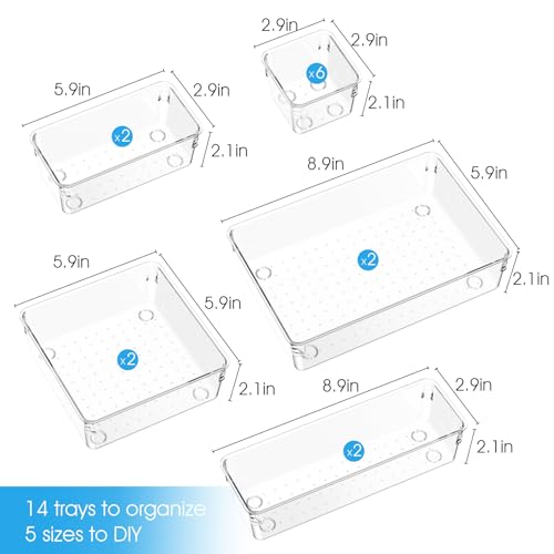 Santiccipa - منظمات أدراج بلاستيكية شفافة للحمام والمكتب والمطبخ- صواني تخزين متعددة الاستخدامات وغير قابلة للانزلاق، حاويات تخزين قابلة للتكديس ومتينة للمكياج والمجوهرات واللوازم المكتبية من سانتيسيبا، 14 قطعة