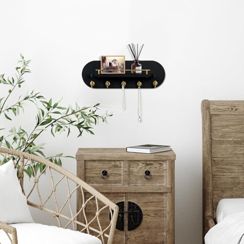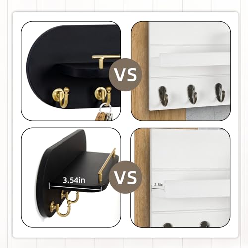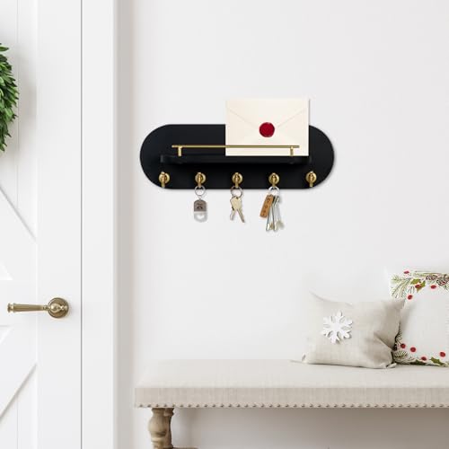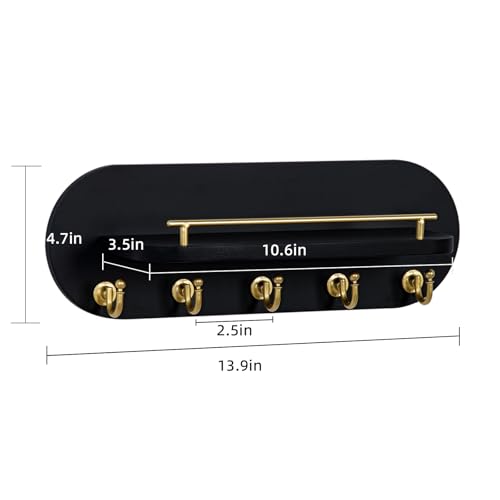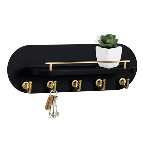 SANY DAYO HOME - حامل مفاتيح خشبي يثبت على الحائط 36 × 13 سم، رف مدخل عائم أبيض مع 5 خطافات بلون ذهبي مع درابزين حماية للمفاتيح والنباتات والاكسسوارات من ساني دايو، لون أسود