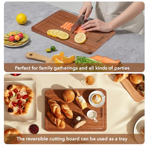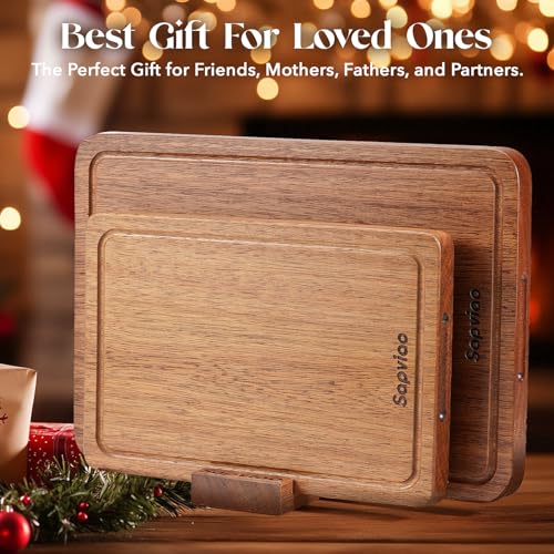 Sapviao - مجموعة لوح تقطيع من خشب الساج من سابفياو بتصميم واحد متين ومناسب للسكين، مع تجاويف عميقة لتجميع السوائل الناتجة عن التقطيع ومقابض مدمجة للمطبخ والخضروات، مقاس 33 × 22 سم و26 × 16 سم