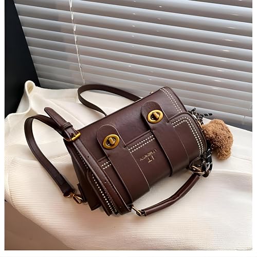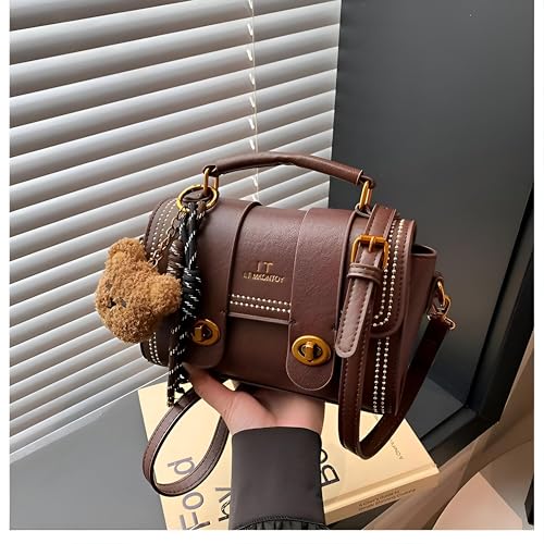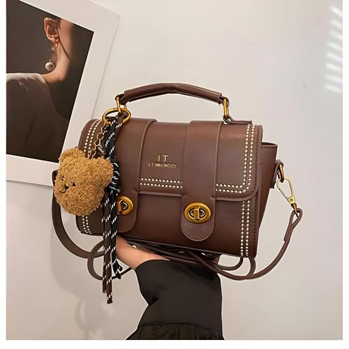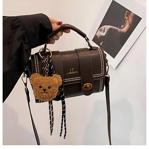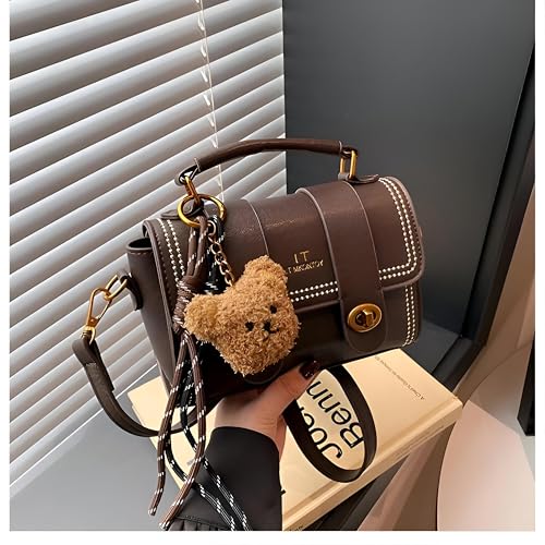 Generic - شنطة ساتشيل - شنطة كتف للنساء مع خياطة متباينة، اكسسوار بتصميم دب مرح، اغلاق دوار متين، تصميم بني انيق للمناسبات الكاجوال
