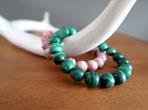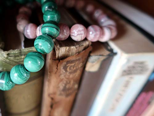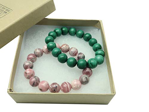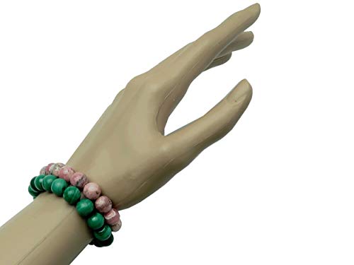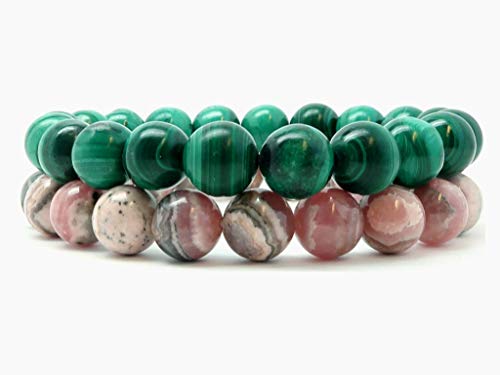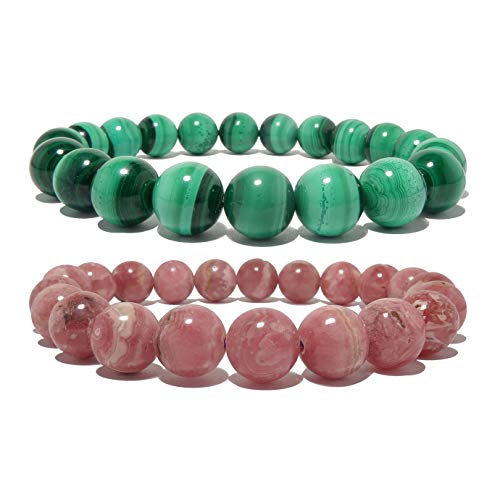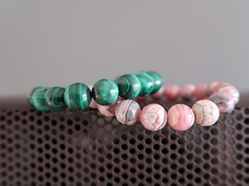 generic - مجموعة اساور مختلطة من كريستال الساتان - حجر المالاكيت الاخضر والرودوكروزيت الزهري الفاخر، احجار كريمة دائرية اصلية قابلة للتكديس قابلة للتكديس B05، احجار كريمة، رودوكروزيت،