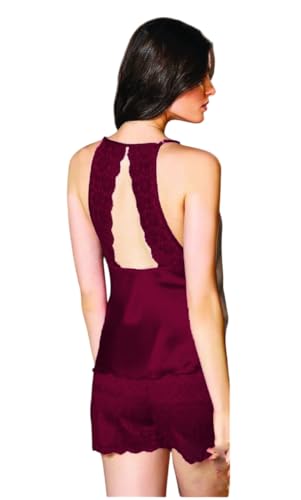 Generic - بيجامة ستان بلوزة حمالات مطعمة بدانتيلا و شورت طبقتين ستان و دانتيلا للنساء