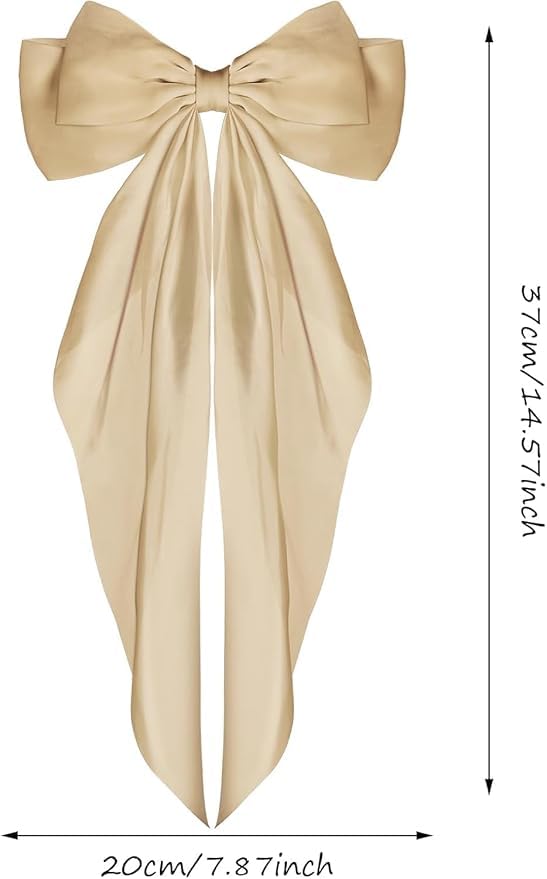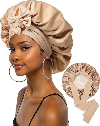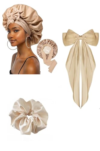 Generic - طقم بونيه نوم ساتان مع فيونكة وربطة شعر، مقاس كبير، بيج، 3 قطع