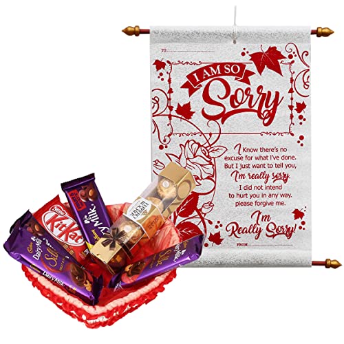 Saugat Traders - بطاقة تمرير على شكل لفافة وسلة خشبية يدوية الصنع مع 5 قطع شوكولاتة هدايا اعتذار، 450 جرام من سوجات تريديرز