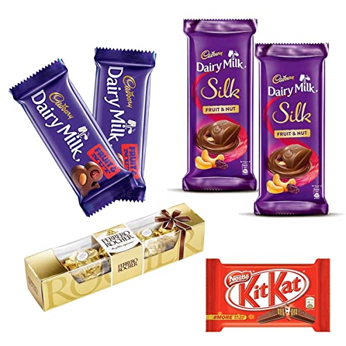 - 1 شوكولاتة كيت كات 37.3 جرام، 2 شوكولاتة بالحليب والفواكه والمكسرات 38 جرام لكل منهما، 2 شوكولاتة بالحليب والفاكهة الحريرية والمكسرات 55 جرام لكل منهما و1 فيريرو روشيه عبوة من 4 قطع - 50 جرام.