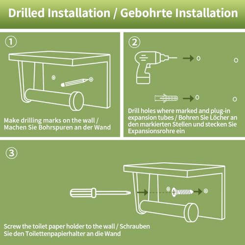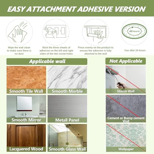 - التصاق قوي: يمكن لحامل بكرة مناديل التواليت المثبت على الحائط استخدام اللاصق الذاتي القوي المتضمن للصق حامل ورق التواليت بإحكام على الحائط لمنع تلف الحائط، أو يمكن تثبيته عن طريق حفر الثقوب باستخدام ملحقات المسامير المرفقة.