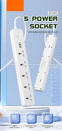 - تصميم متعدد الوظائف: مشترك كهرباء LDNIO SC5319 يوفر 5 مقابس عالمية و3 منافذ USB ذكية بقدرة إجمالية 38 واط تشمل منفذ PD 20 واط ومنفذ QC 3.0 للشحن السريع