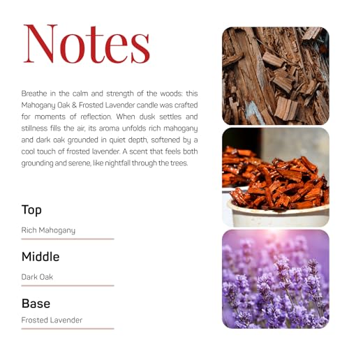 - خشب البلوط الماهوجني واللافندر المتجمد. مزيج عميق من خشب الماهوجني الغني والبلوط الداكن واللافندر الذي يوازن بين القوة والصفاء مثل أمسية الغابة الهادئة.
