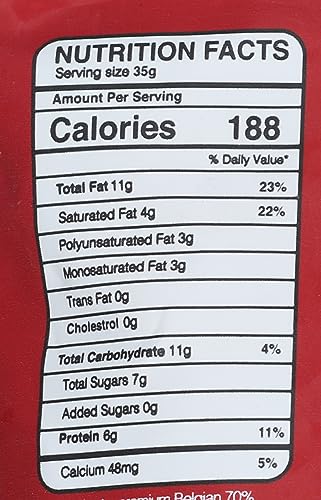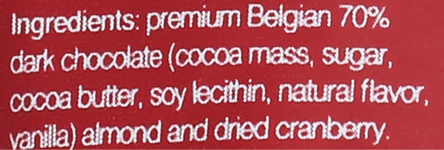 - قطع شوكولاتة بلجيكية داكنة بنسبة 70% عالية الجودة ستدلل حواسك، وستشعر بنكهتها الغنية مع قرمشة اللوز المحمص الناعم وقوام التوت البري الأحمر الحلو