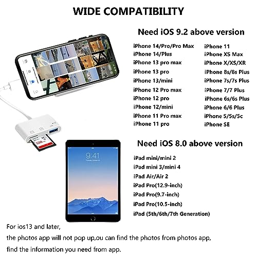 - محول قارئ كاميرا 3 في 1: قم بتبسيط عملية نقل البيانات الخاصة بك مع محول قارئ الكاميرا متعدد الاستخدامات الخاص بنا لأجهزة ايفون وايباد. يدعم بطاقات SD وMicro SD (TF) وذاكرة فلاش USB، مما يضمن التوافق مع جميع أجهزة ايفون التي تعمل بنظام iOS 9.2 أو أعلى وأجهزة ايباد التي تعمل بنظام iOS 8.0 أو أعلى. يمكنك تنزيل الصور ومقاطع الفيديو بسهولة مباشرة من بطاقة SD الخاصة بك إلى جهاز ايفون أو ايباد الخاص بك، مما يلغي الحاجة إلى نقل الملفات المعقدة.