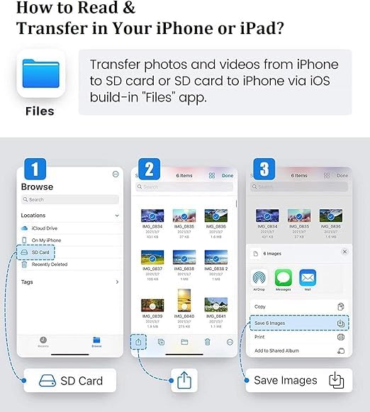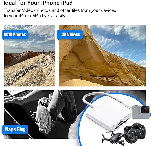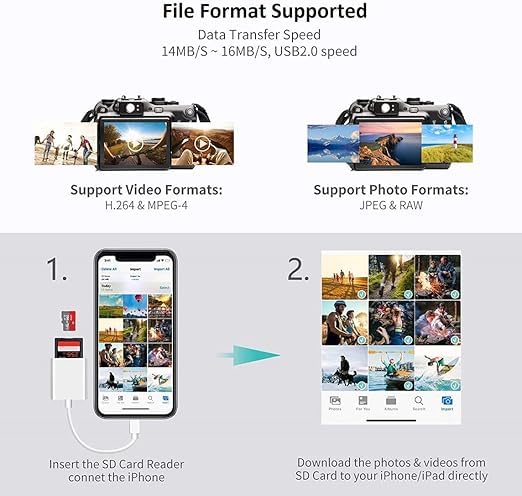 - إذا كنت من عشاق التصوير الفوتوغرافي، فإن قارئ بطاقات SD 2 في 1 هذا لأجهزة آيفون واي باد سيفيدك كثيرًا. يدعم بطاقات SD/TF بسعة تصل إلى 256 جيجابايت من الكاميرات الرقمية/SLR، كاميرات التتبع، طائرات درون بدون طيار، شاشات الحياة البرية، كاميرات لوحة القيادة، وغيرها، مما يحرر مساحة أجهزتك!