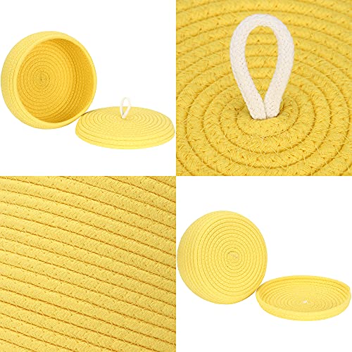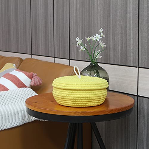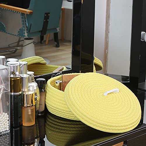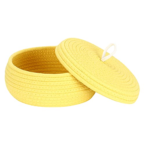 Sea Team - سلة تخزين دائرية من الحبال القطنية مع غطاء، سبت تخزين منسوج ومزخرف، حامل لحفظ وتنظيم الوجبات الخفيفة والفوط والنباتات من سي تيم، مقاس 25×11 سم (مقاس سمول، منخفضة الحواف، لون أصفر)