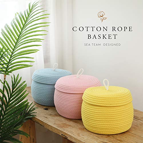 Sea Team - سلة تخزين دائرية من الحبال القطنية مع غطاء، صندوق تخزين منسوج مزخرف، علبة حفظ الأغراض، منظم للوجبات الخفيفة والفوط والنباتات من سي تيم، 25 × 25 × 19 سم، (مقاس صغير S، لون أصفر)