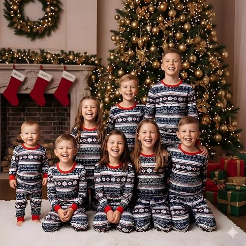 Generic - طقم نوم موسمي - بيجامة عائلية للكريسماس بتصميم ندفة الثلج مع لمسة حمراء واكمام طويلة لليالي العطلات المريحة