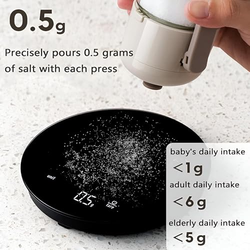 - تم تصميم شاكر الملح الدقيق لتوزيع 0.5 جرام من الملح بالضبط مع كل ضغطة، مما يسمح لك بالتحكم في تناول الملح اليومي بفعالية. هذه الميزة مفيدة بشكل خاص لأولئك المهتمين بالصحة ويريدون تجنب الاستهلاك المفرط للملح في وجباتهم.