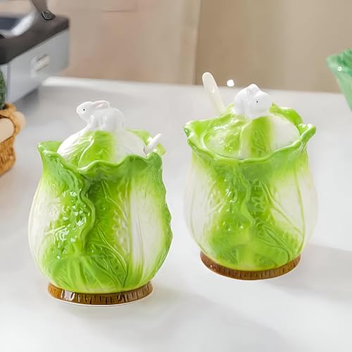 Generic - مجموعة علب توابل - برطمان سيراميك مزخرف على شكل ملفوف مع غطاء وملعقة مثالي لتخزين التوابل أو البهار أو المُحليات على سطح الطاولة (2 قطعة)