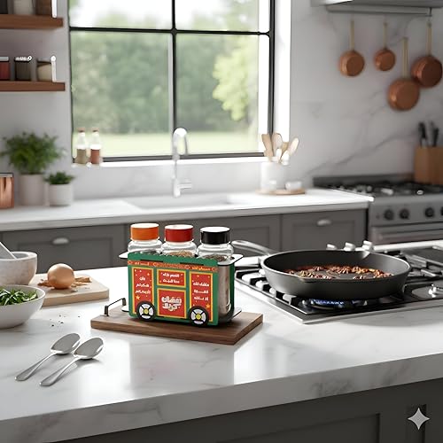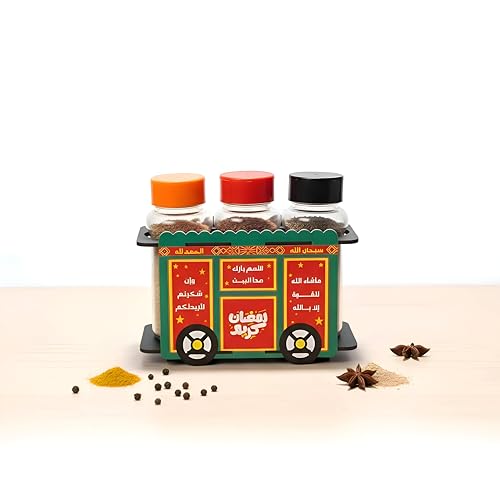 - طقم علب توابل أنيقة مكون من 3 قطع، تقدم في صندوق خشبي مصنوع يدويًا على شكل عربة تراثية، ليضفي لمسة من عبق التراث على مائدتك الرمضانية.