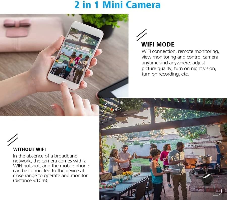 - كاميرا مراقبة 2 في 1 - واي فاي وبطاقة اس دي: يمكن للكاميرا الصغيرة تسجيل مقاطع الفيديو عبر واي فاي أو بدون واي فاي. يدعم وضع الواي فاي العرض في الوقت الفعلي على هاتفك. بدون واي فاي، يمكنه أيضًا تسجيل مقاطع الفيديو وحفظها على بطاقة SD (بطاقة SD غير متضمنة)