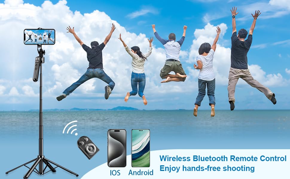 - غالق بلوتوث للتحكم عن بعد: تأتي مع جهاز تحكم عن بعد لاسلكي يتصل بهاتفك الذكي عبر تقنية البلوتوث، مما يسمح لك بالتقاط الصور أو بدء/إيقاف مقاطع الفيديو من مسافة تصل إلى 10 أمتار. مثالية لالتقاط الصور الجماعية والتصوير الفردي.