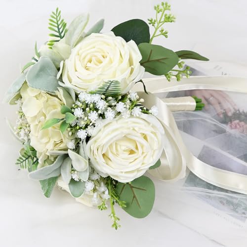 - 【باقة زفاف جميلة】تحتوي باقات الزفاف هذه على ورود بيضاء عاجية وكوبية ونفس الطفل والأوكالبتوس وأوراق الورد وأشرطة. باقات الزفاف الاصطناعية مصنوعة يدويًا، بسيطة وأنيقة، ألوان زاهية ومريحة، مثالية لتزيين حفل زفافك.